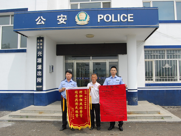 6月4日上午,兴源镇兴鲜村村民毕树国将一面绣着“肝胆相照好警官,同舟共济民称赞”的锦旗送到兴源派出所,同时送来一封感谢信,感谢该所民警及时求助其儿子,并说到,“我为兴源镇派出所有这样的好警官而骄傲与自豪!”。